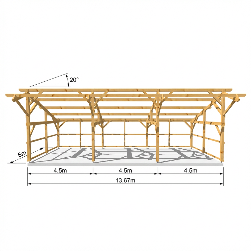 LIVERPOOL Hangar bois FERMABLE sur 3 côtés / 2 pans 6.0 x 13.67m 20° de pente SANS BARDAGE / Livraison OFFERTE