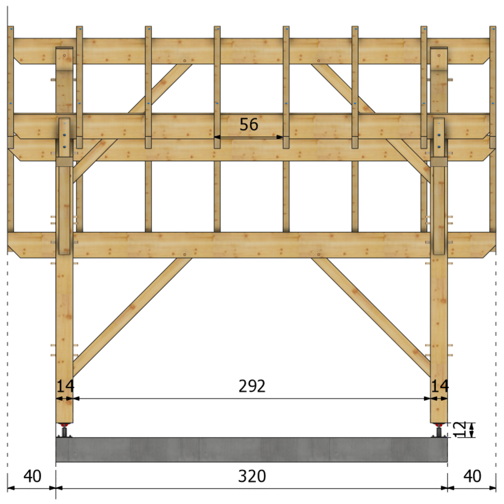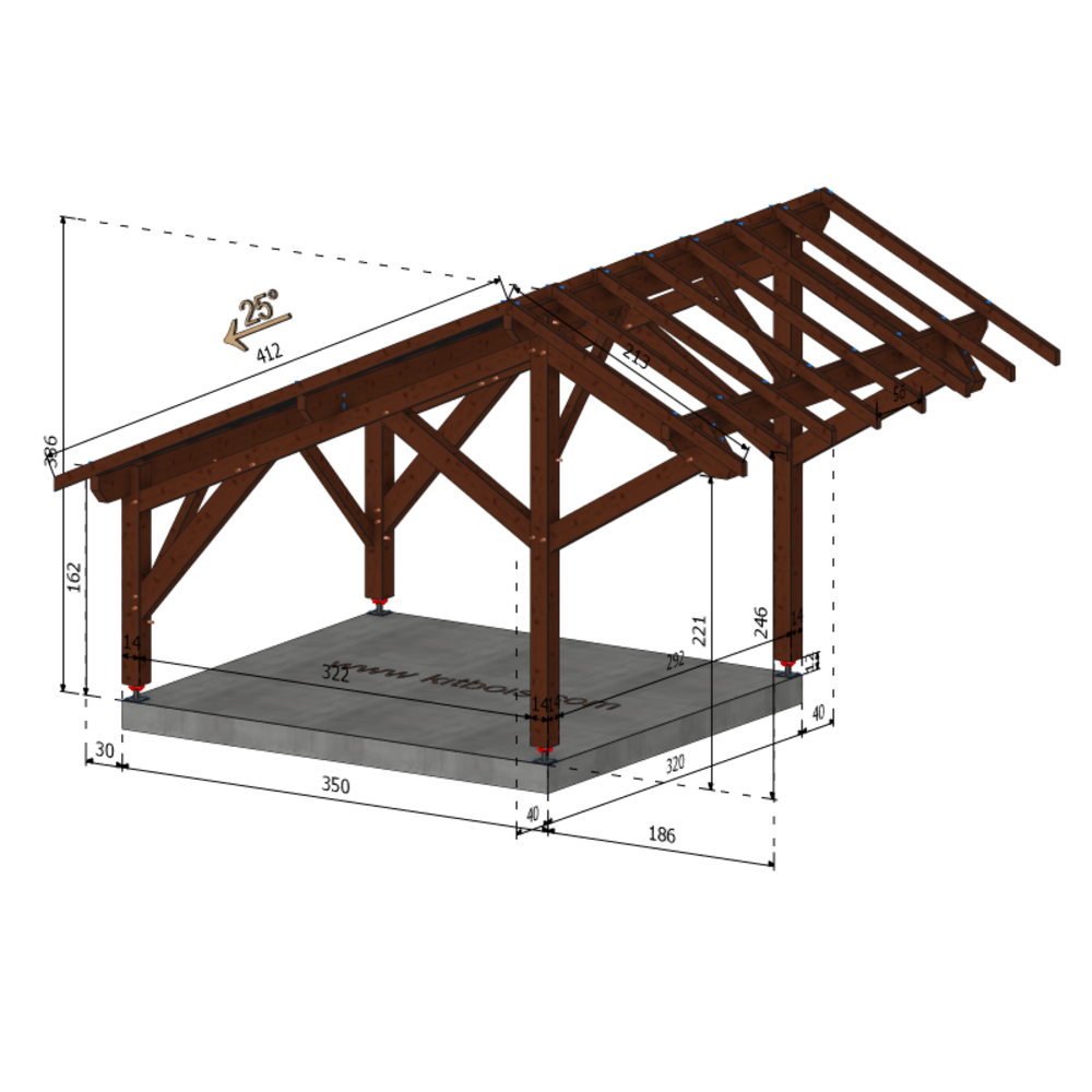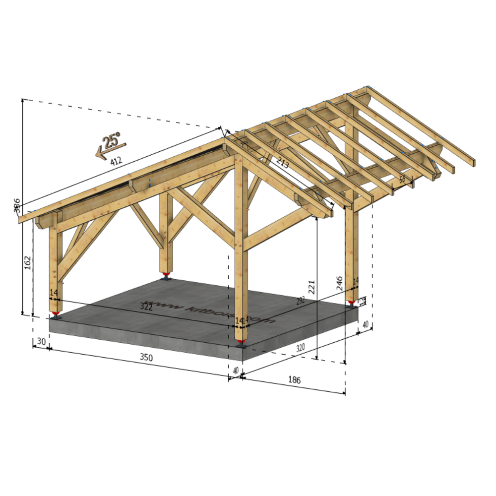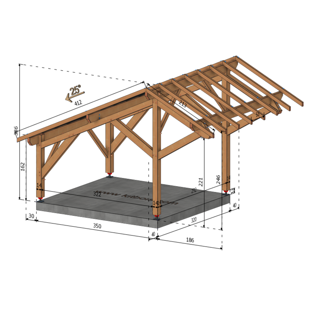 * Surface dalle béton (à réaliser par vos soins) | 3.5 m x 3.2 m ou 4 plots de minimum 30x30x50 cm sous chaque poteaux.