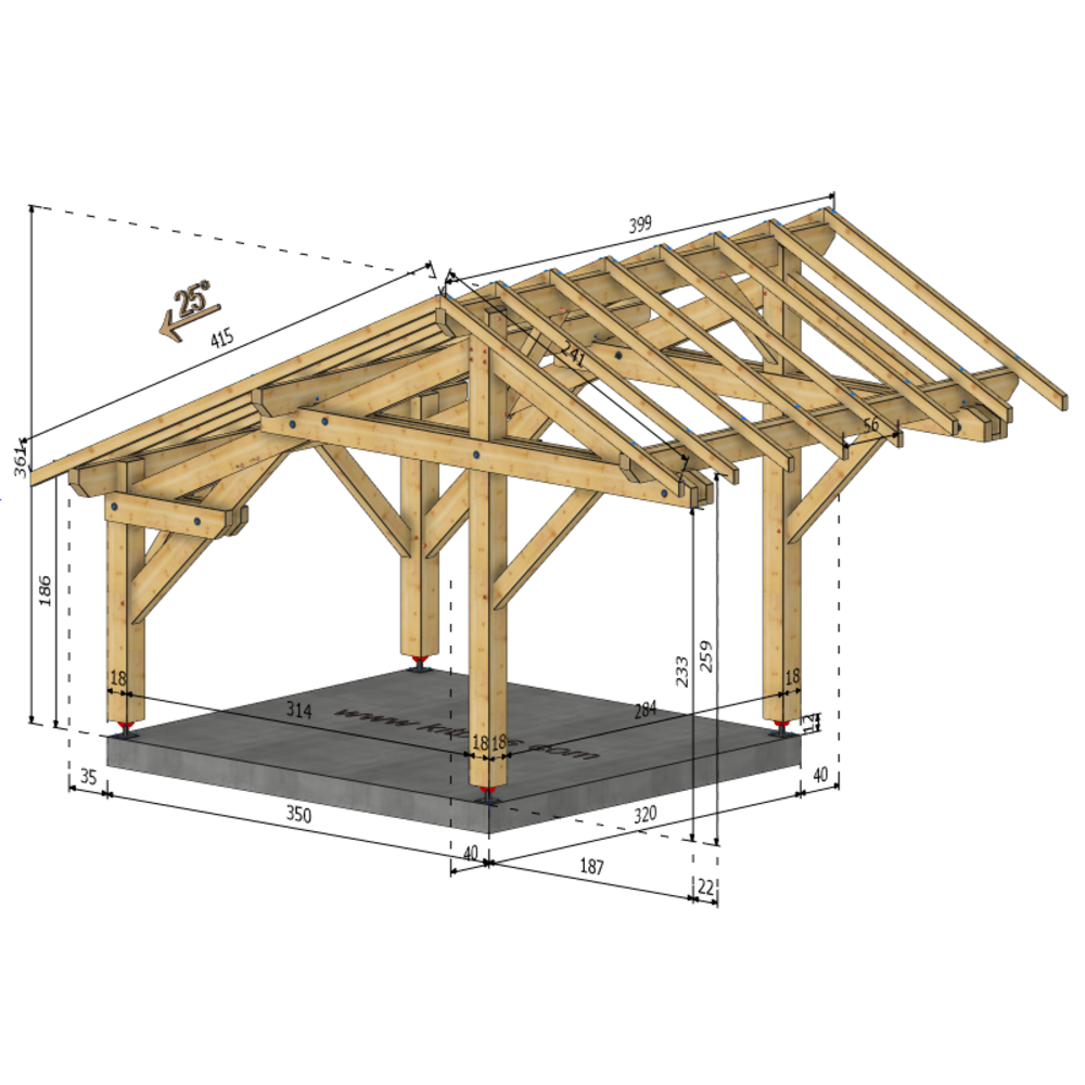 * Surface dalle béton (à réaliser par vos soins) | 3.5 m x 3.2 m ou 4 plots de minimum 30x30x50 cm sous chaque poteaux.