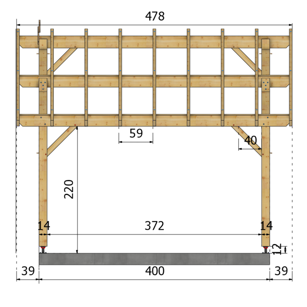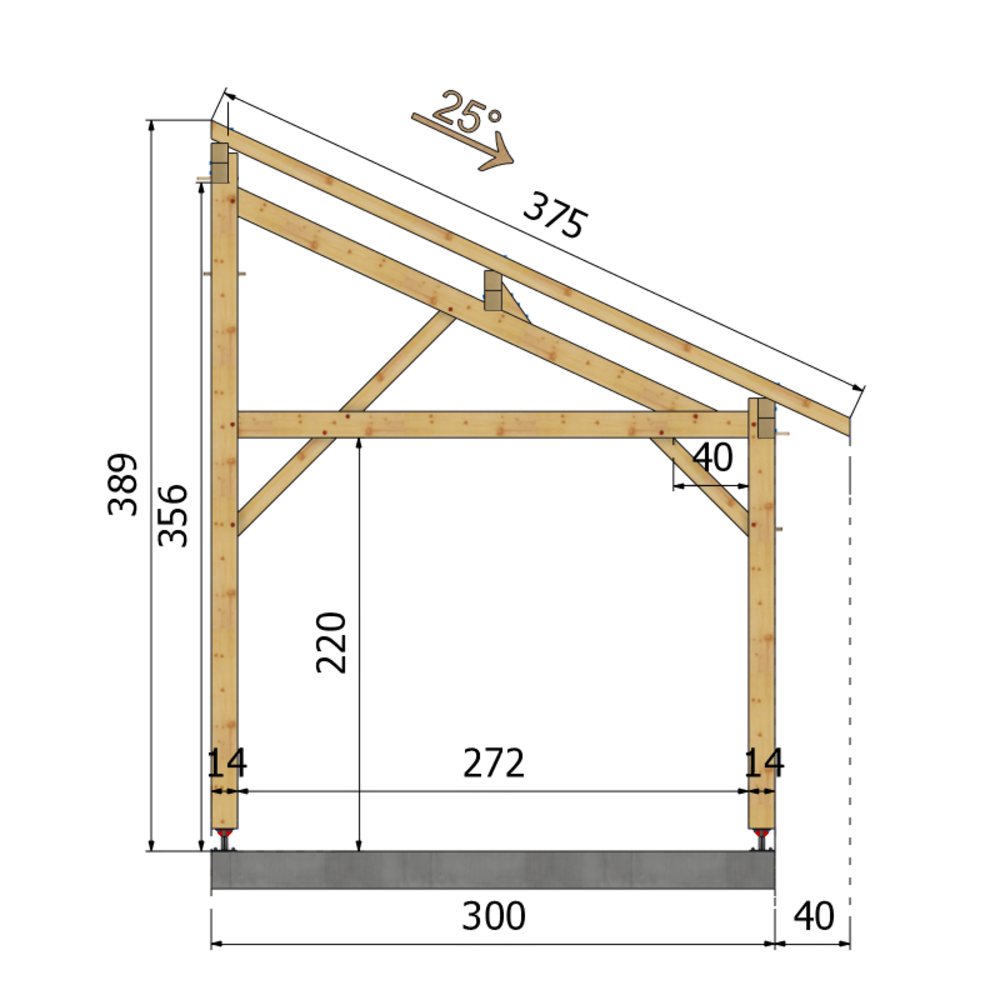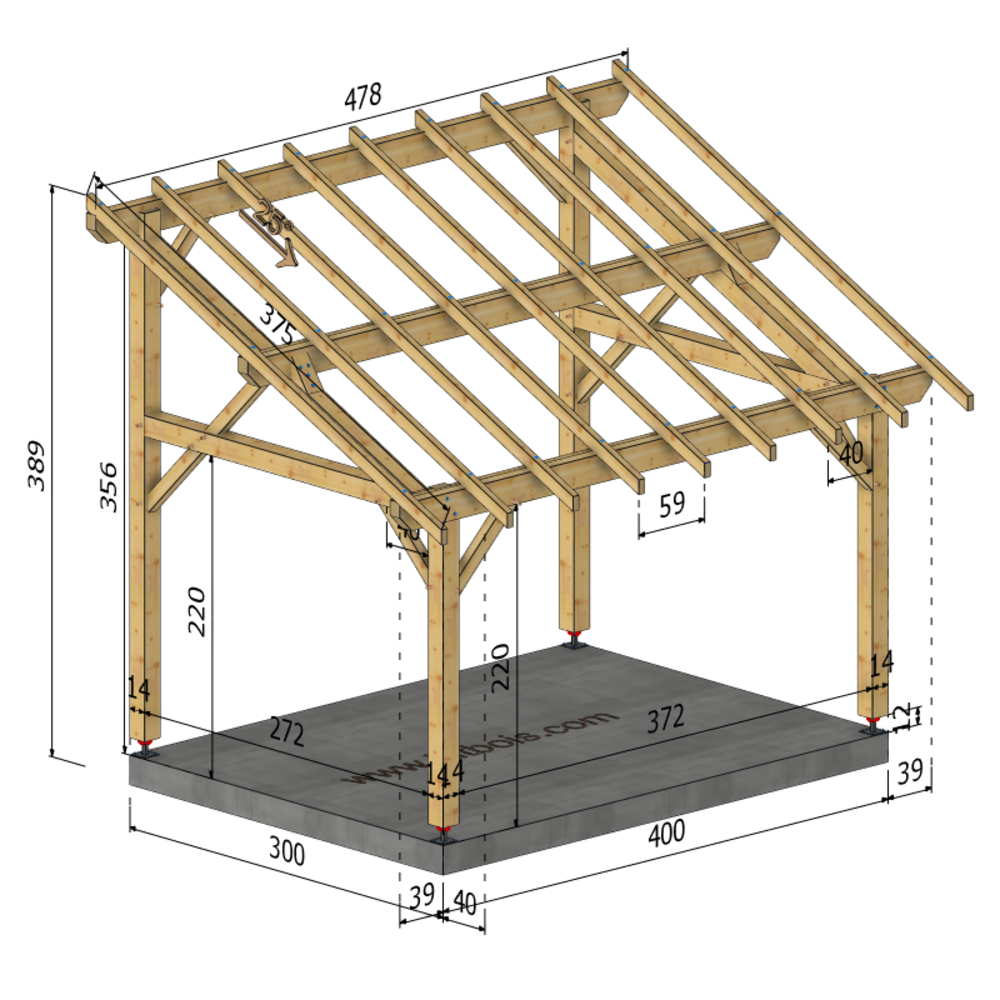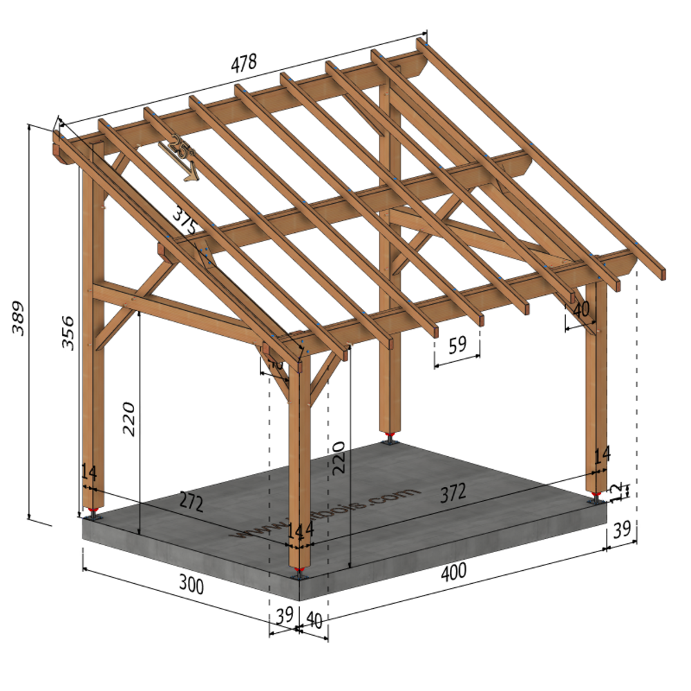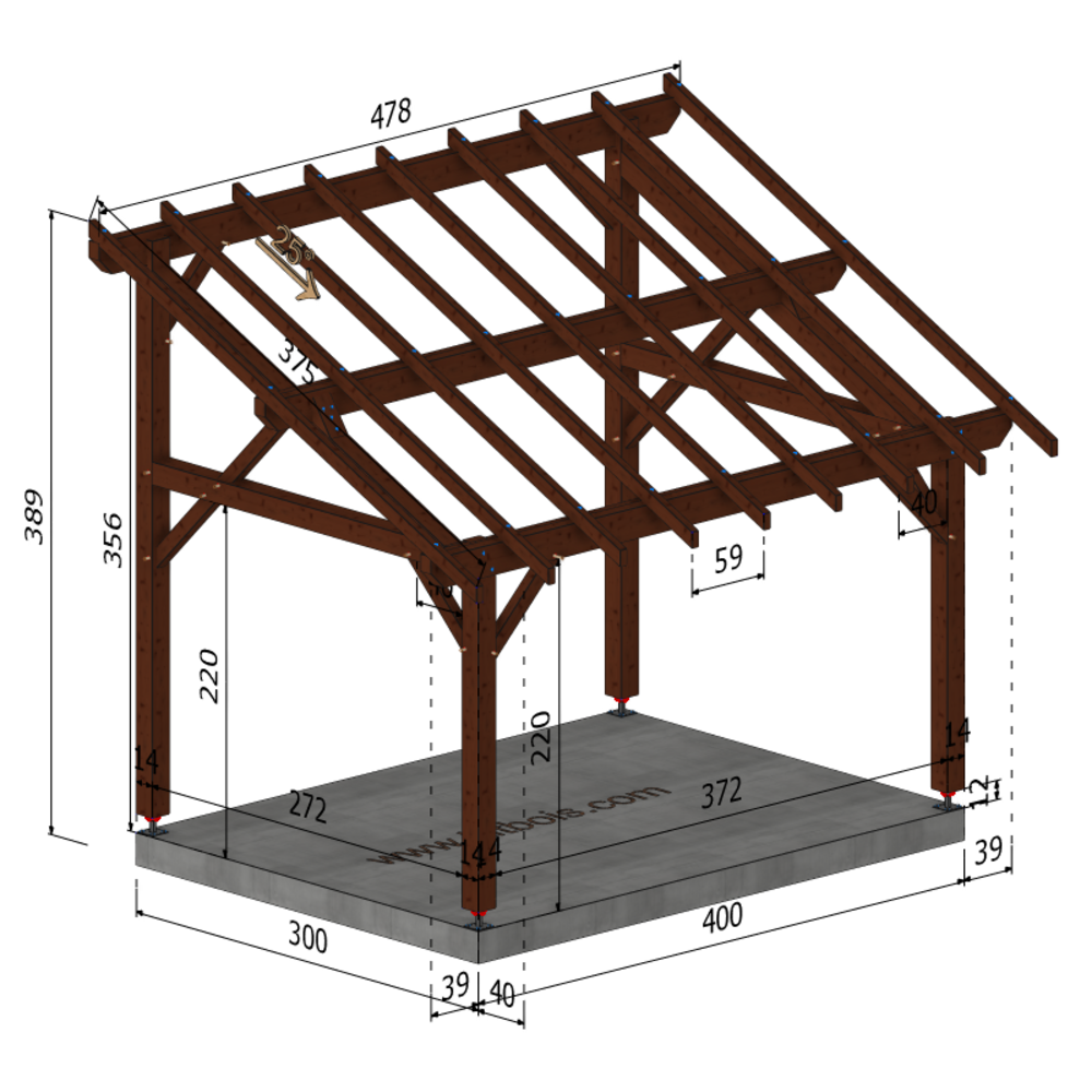 * Surface dalle béton (à réaliser par vos soins) | 3 m x 4 m ou 4 plots de minimum 30x30x50 cm sous chaque poteaux.