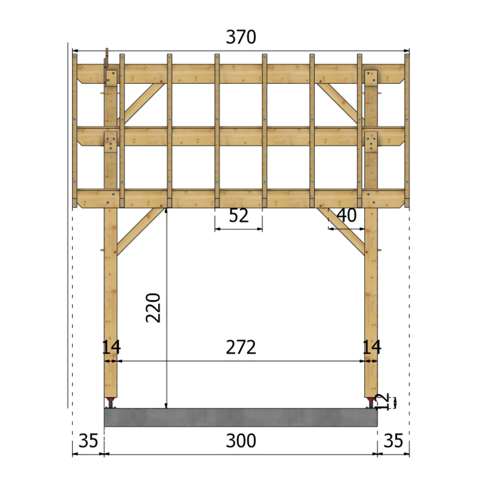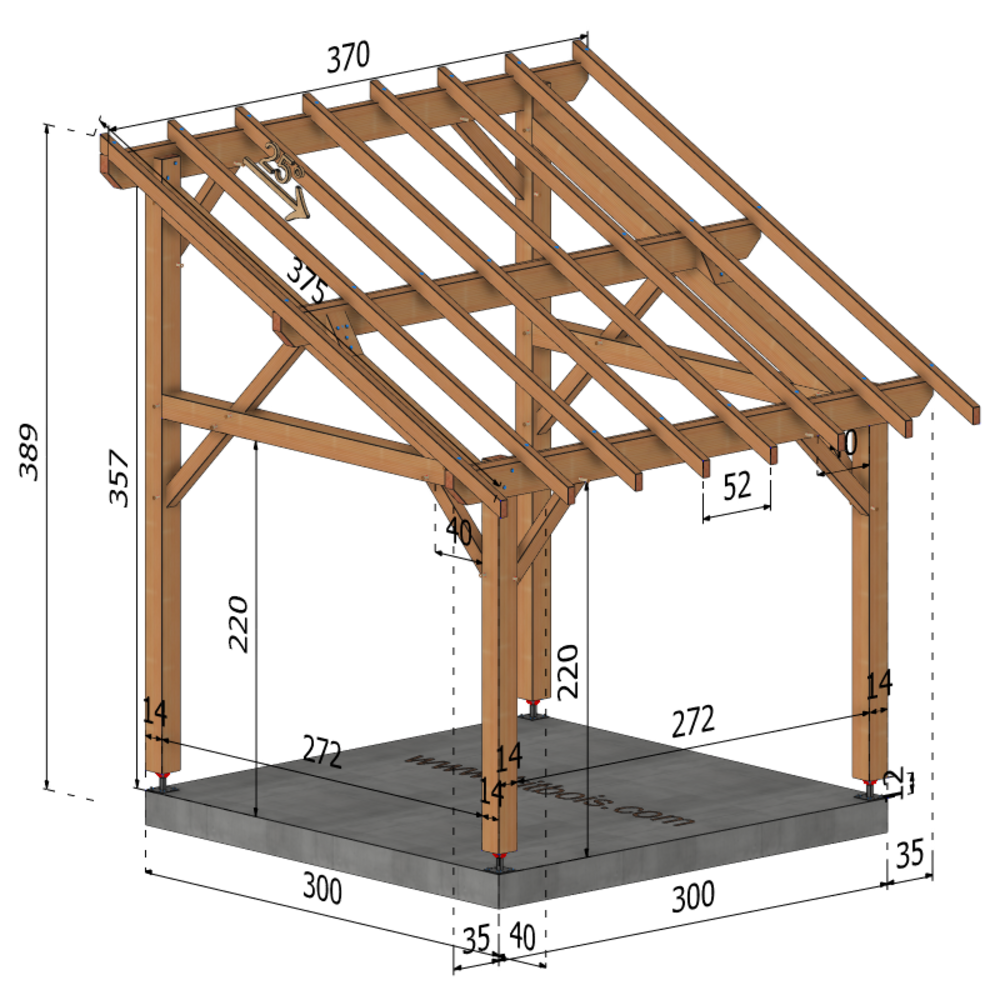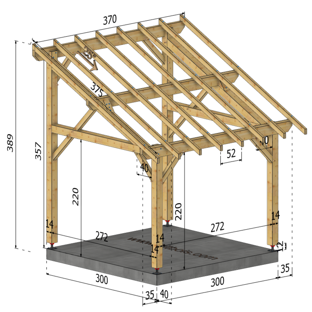* Surface dalle béton (à réaliser par vos soins) | 3 m x 3 m ou 4 plots de minimum 30x30x50 cm sous chaque poteaux.