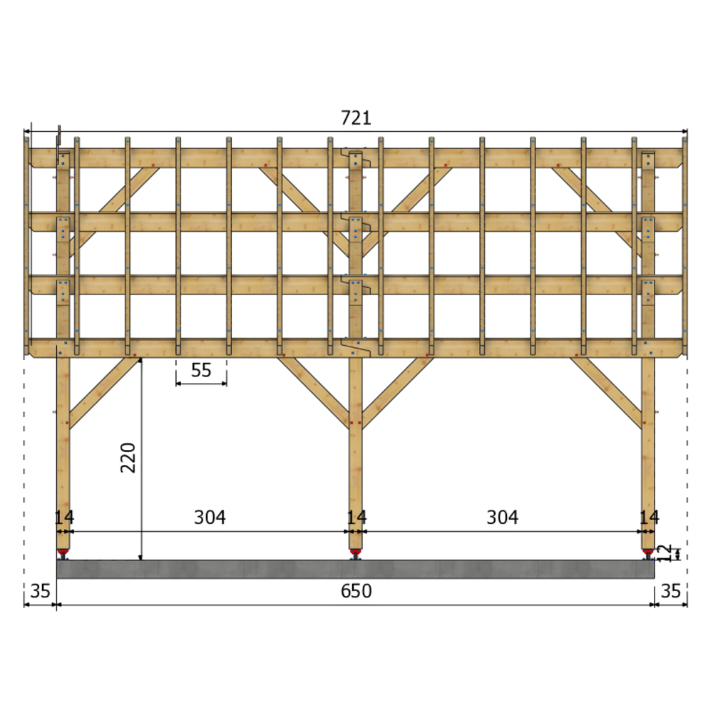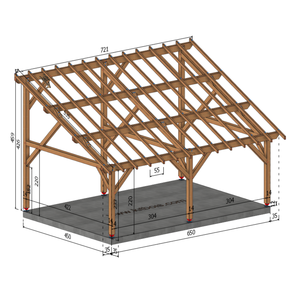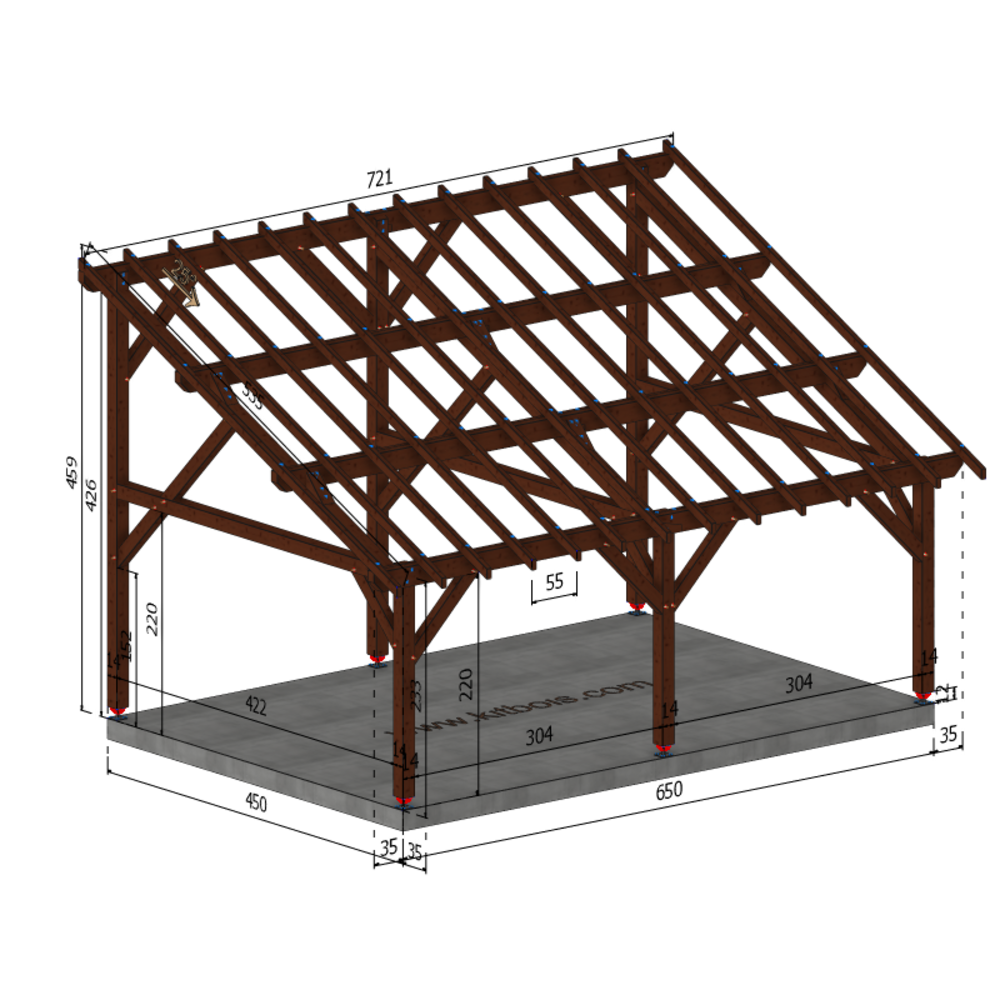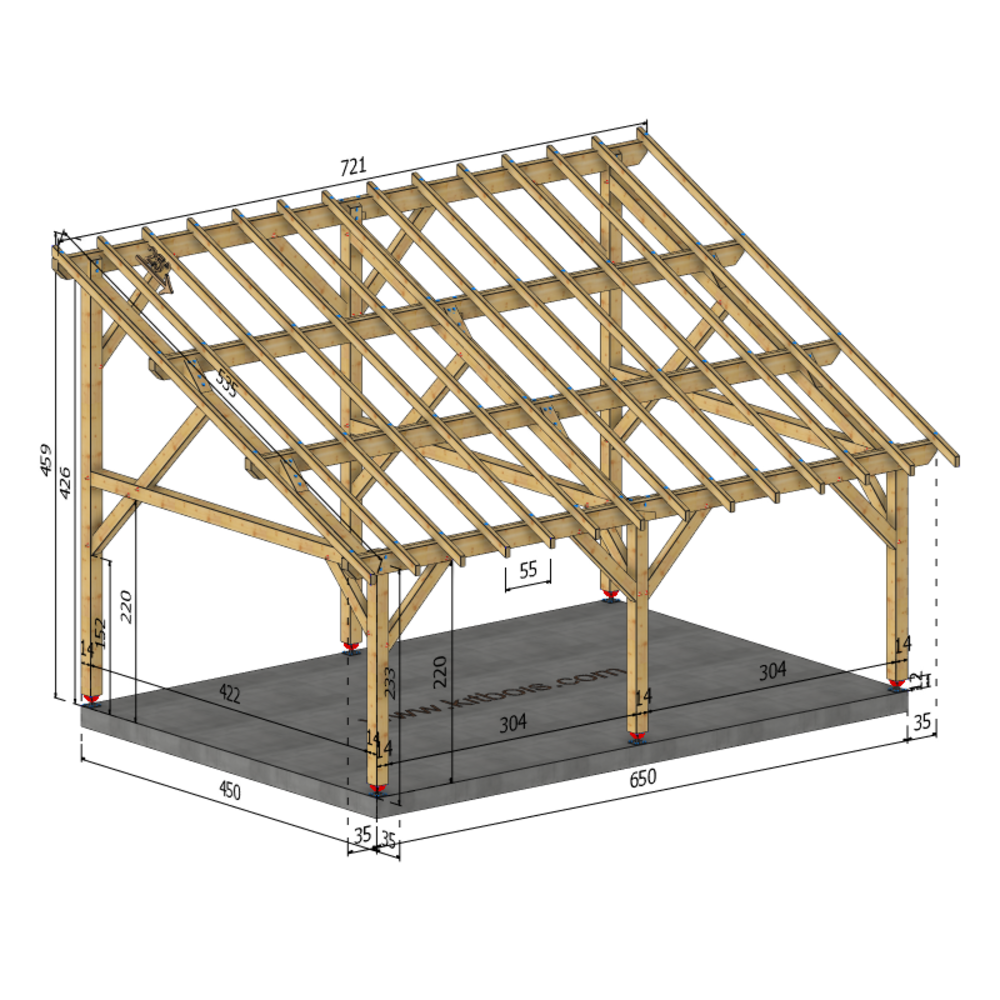 * Surface dalle béton (à réaliser par vos soins) | 4.5 m x 6.5 m ou 4 plots de minimum 30x30x50 cm sous chaque poteaux.