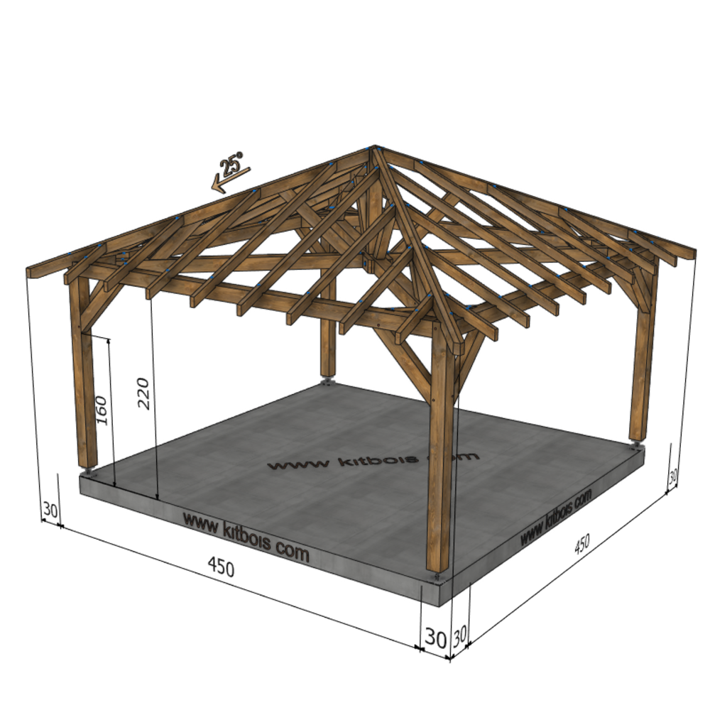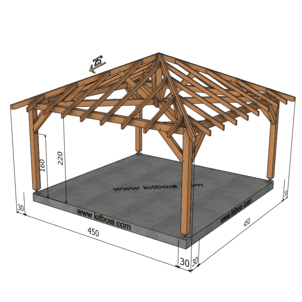* Surface dalle béton (à réaliser par vos soins) | 4.5 m x 4.5 m ou 4 plots de minimum 30x30x50 cm sous chaque poteaux.