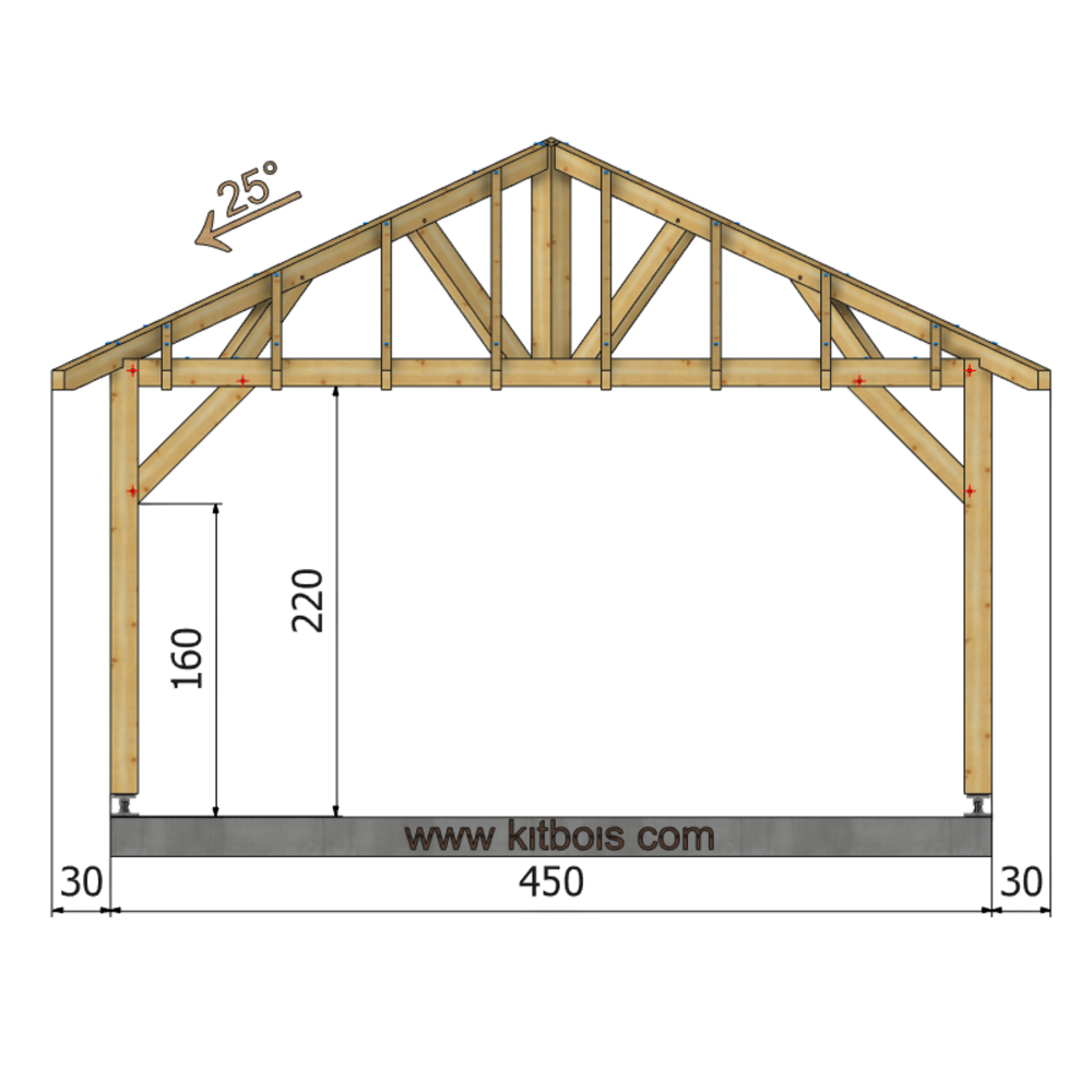 Largeur 4.5m Longueur 4.5m. Passage de 4.22m entre poteaux. Hauteur de passage 2.20m à l'avant et sur les côtés. Pente 25°.