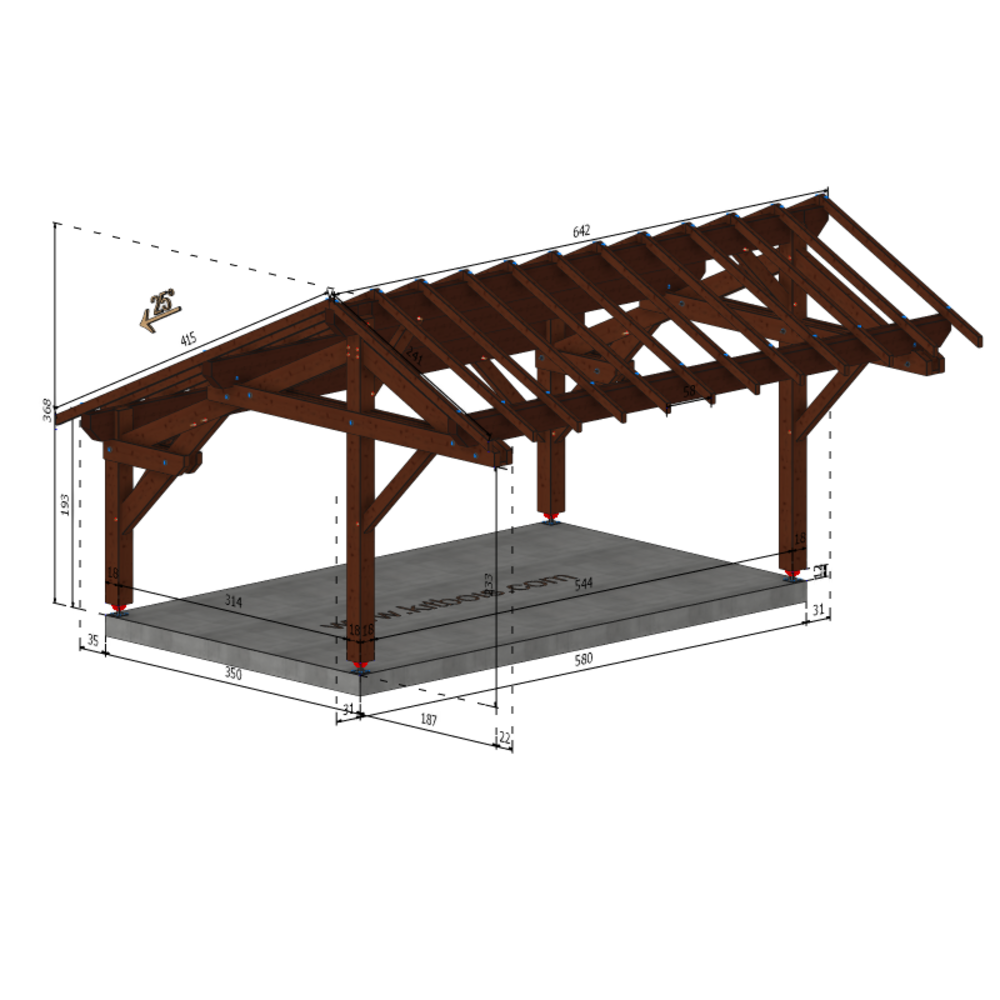 * Surface dalle béton (à réaliser par vos soins) | 3.5 m x 5.8 m ou 4 plots de minimum 30x30x50 cm sous chaque poteaux.