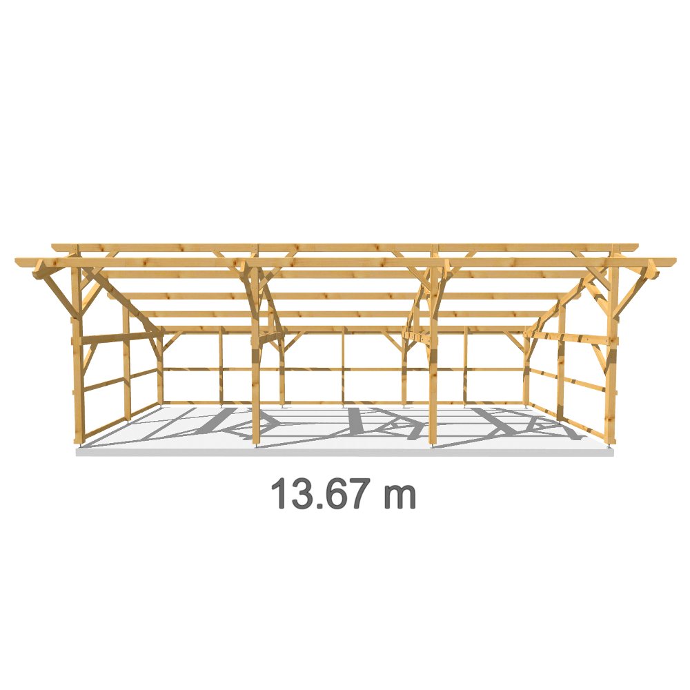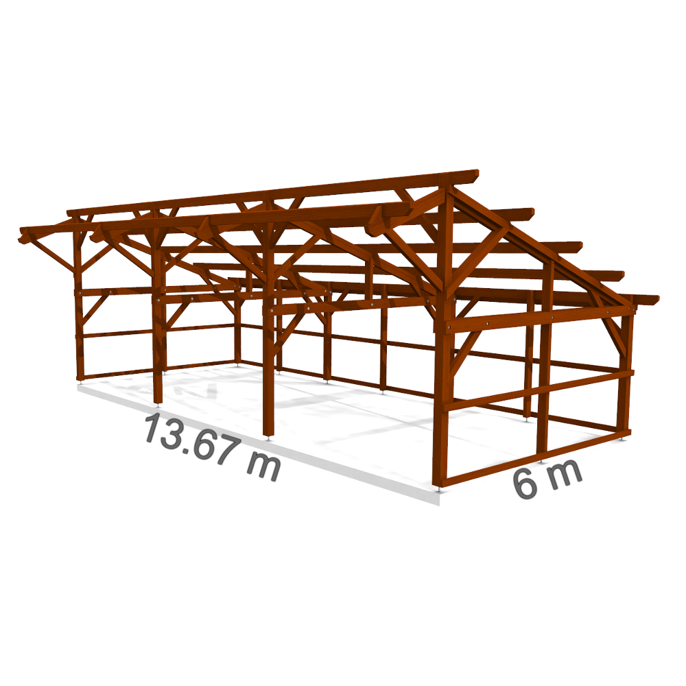 Bâtiment de stockage 6 m de largeur par 13.67 m de longueur sur poteaux 17x17 en sapin raboté. Pannes 9x21 cm en sapin raboté. Traitement classe II / ou option de traitement autoclave marron avec plus-value. (Douglas nous consulter)