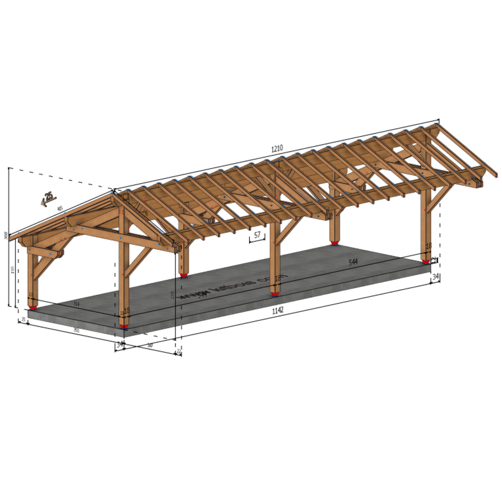 * Surface dalle béton (à réaliser par vos soins) | 3.5 m x 11.42 m ou 4 plots de minimum 30x30x50 cm sous chaque poteaux.