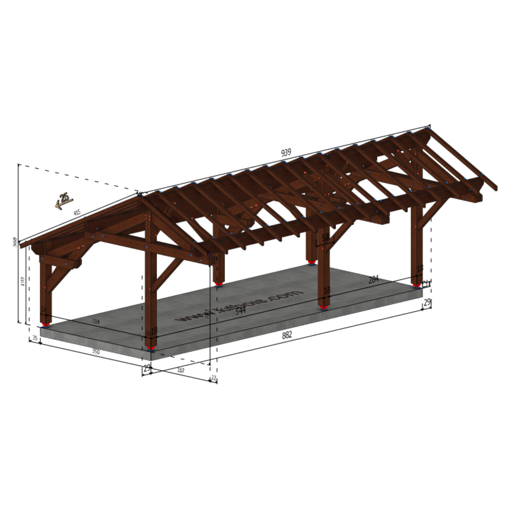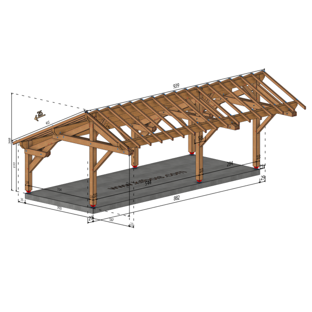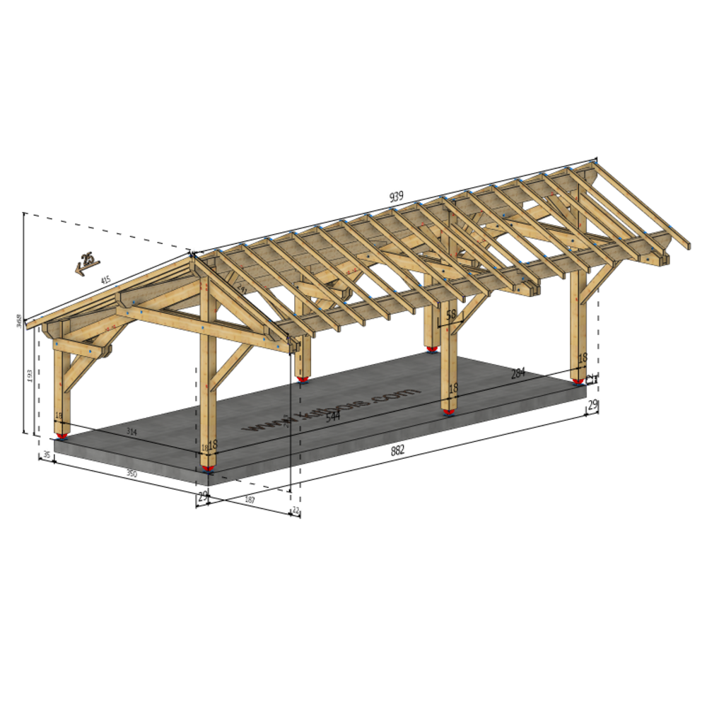 * Surface dalle béton (à réaliser par vos soins) | 3.5 m x 8.82 m ou 4 plots de minimum 30x30x50 cm sous chaque poteaux.