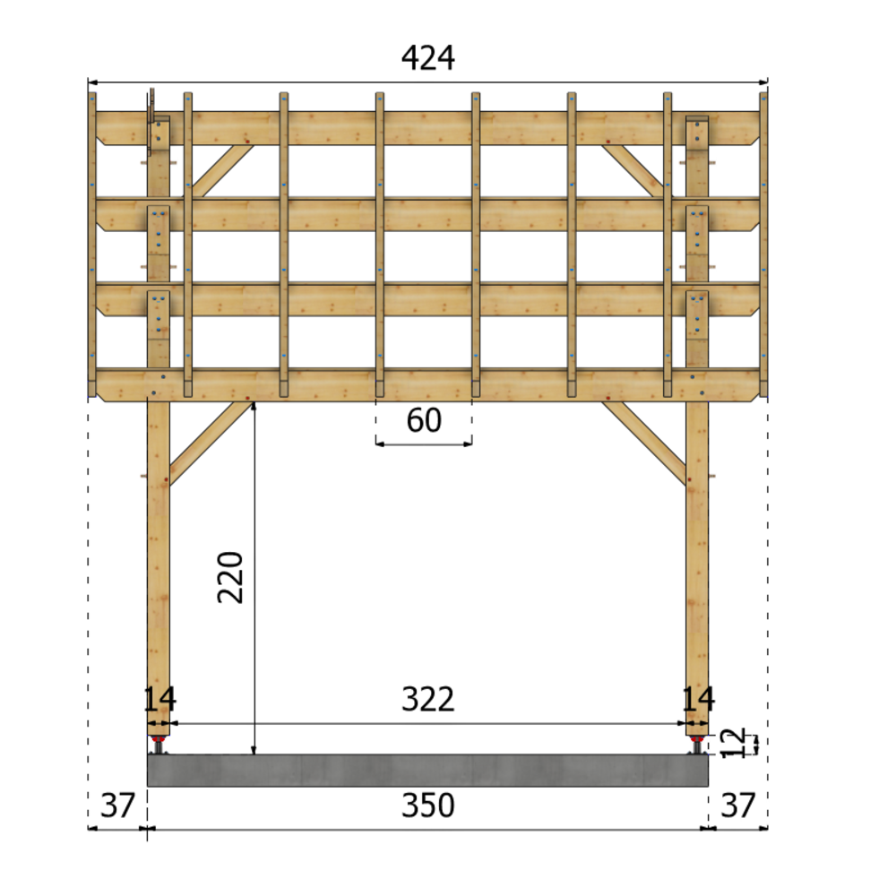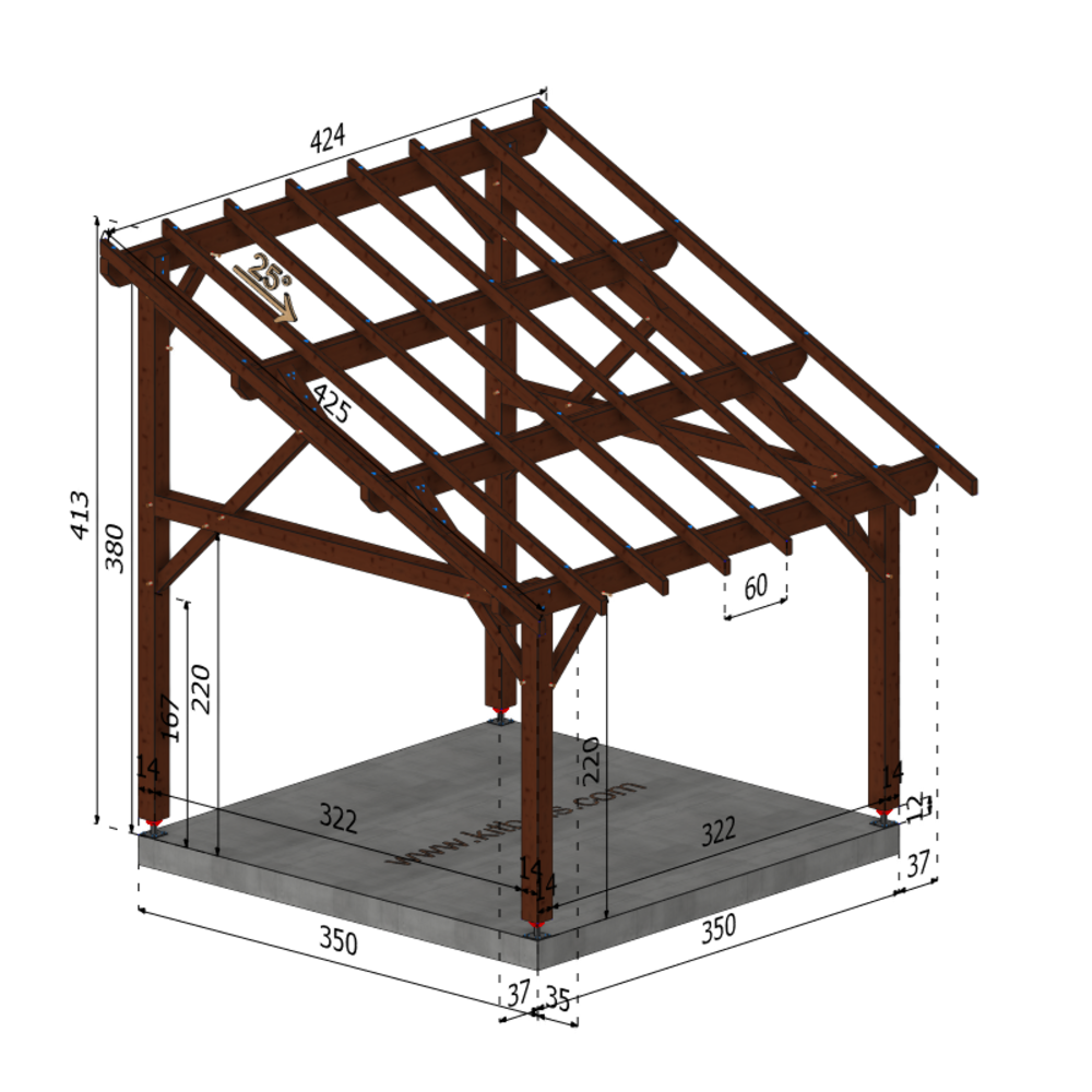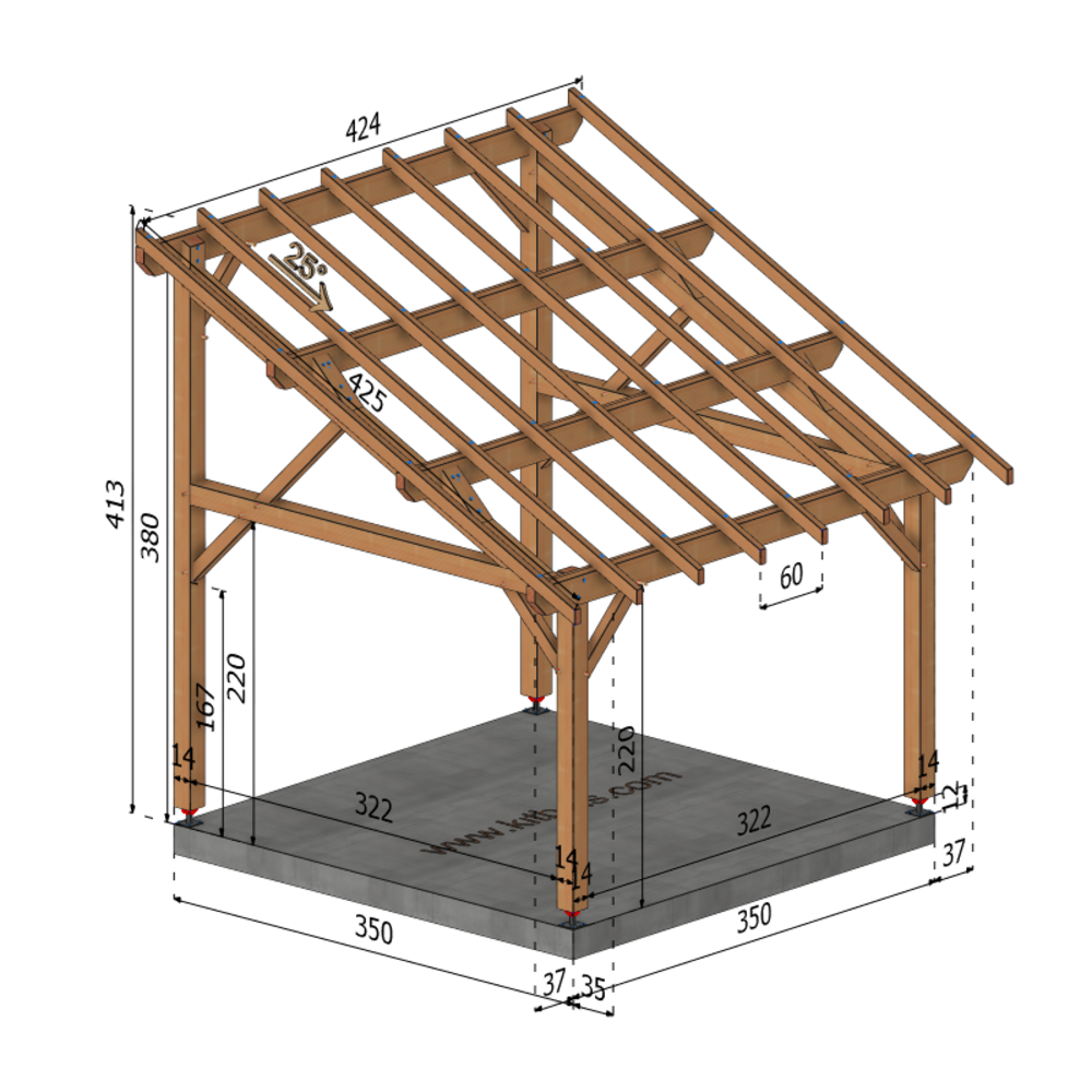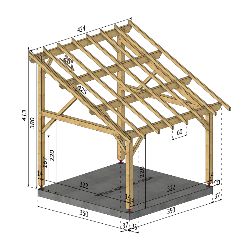 * Surface dalle béton (à réaliser par vos soins) | 3.5 m x 3.5 m ou 4 plots de minimum 30x30x50 cm sous chaque poteaux.