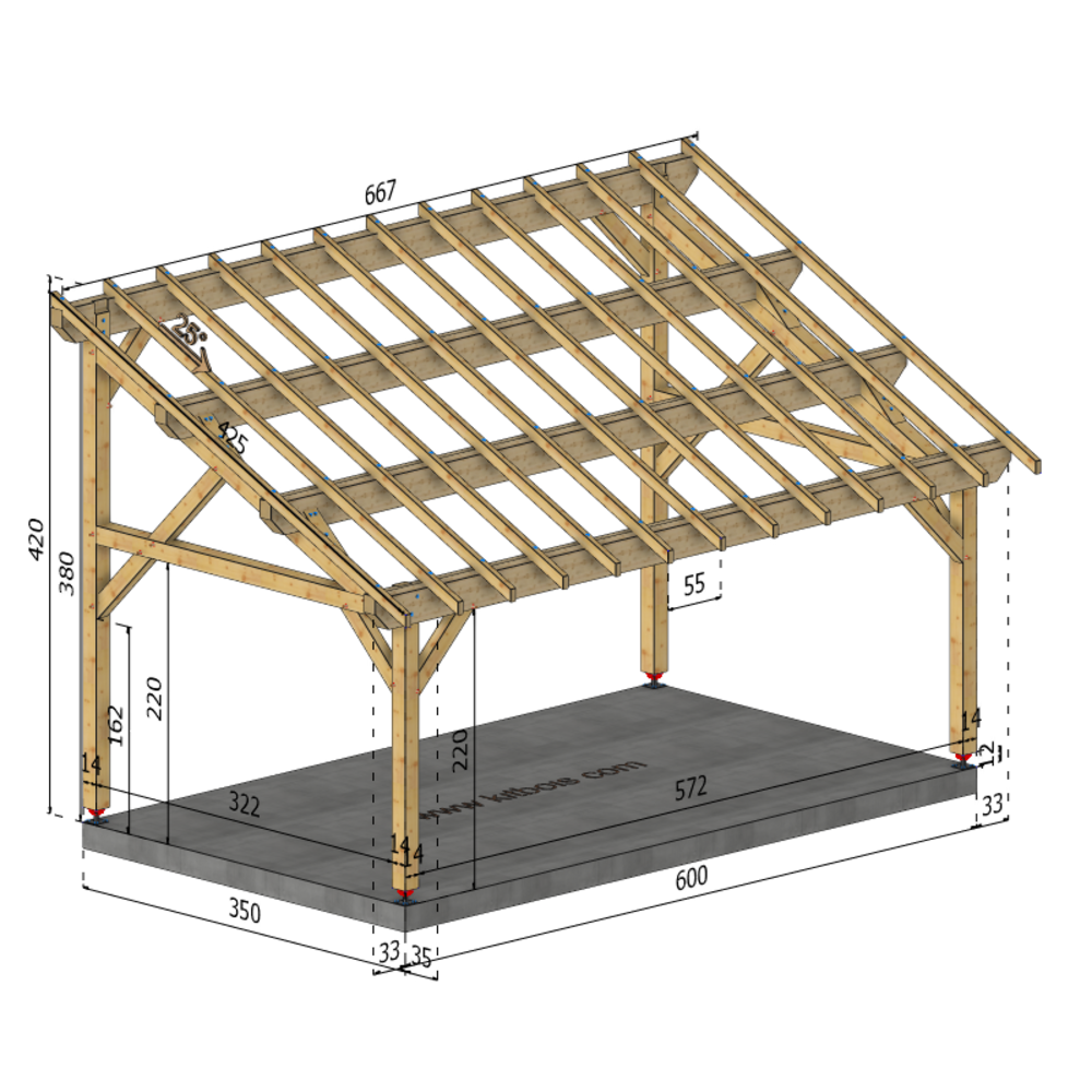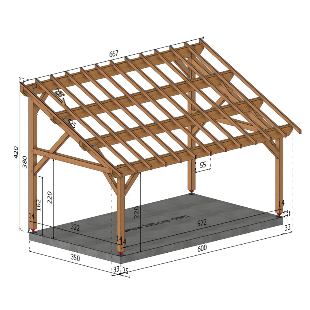 * Surface dalle béton (à réaliser par vos soins) | 3.5 m x 6 m ou 4 plots de minimum 30x30x50 cm sous chaque poteaux.