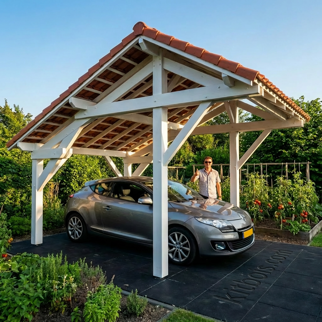 Ce modèle de auvent 2 pentes inégales, adapté à la tuile Alpha 10 (ou autre) convient pour abriter une voiture.