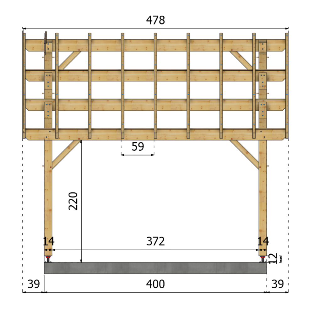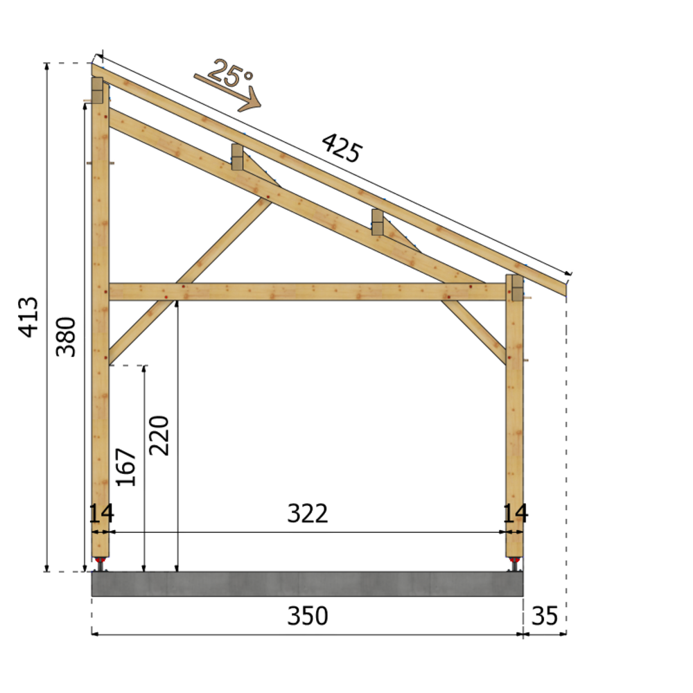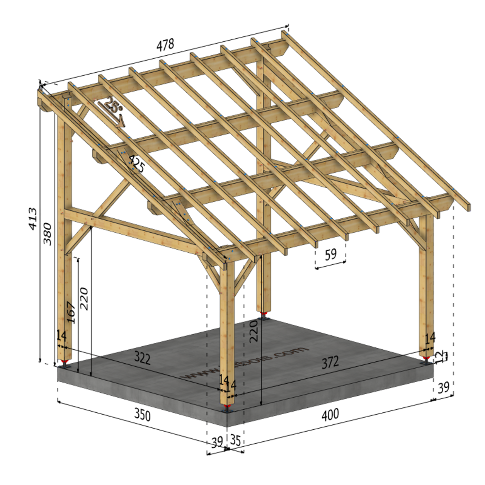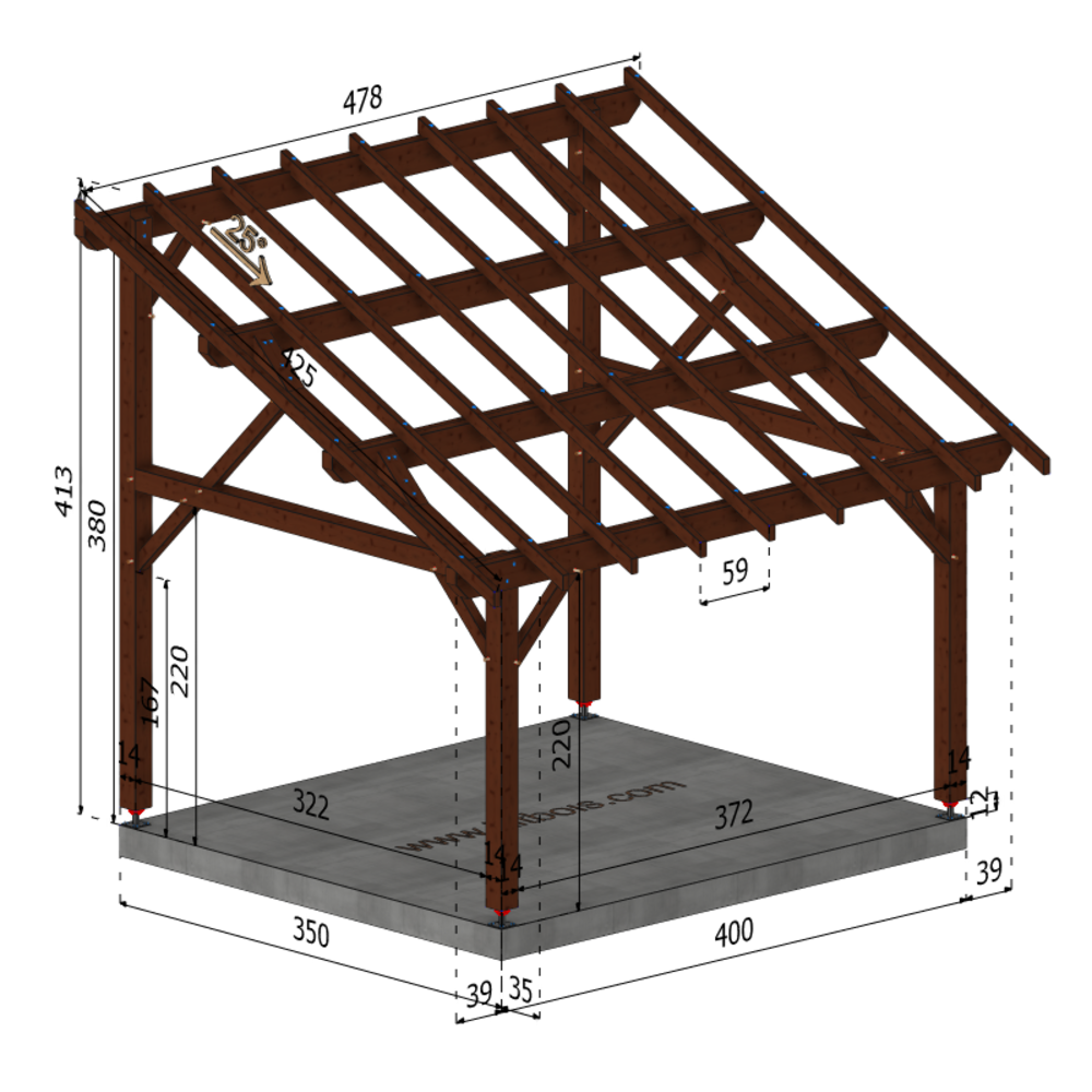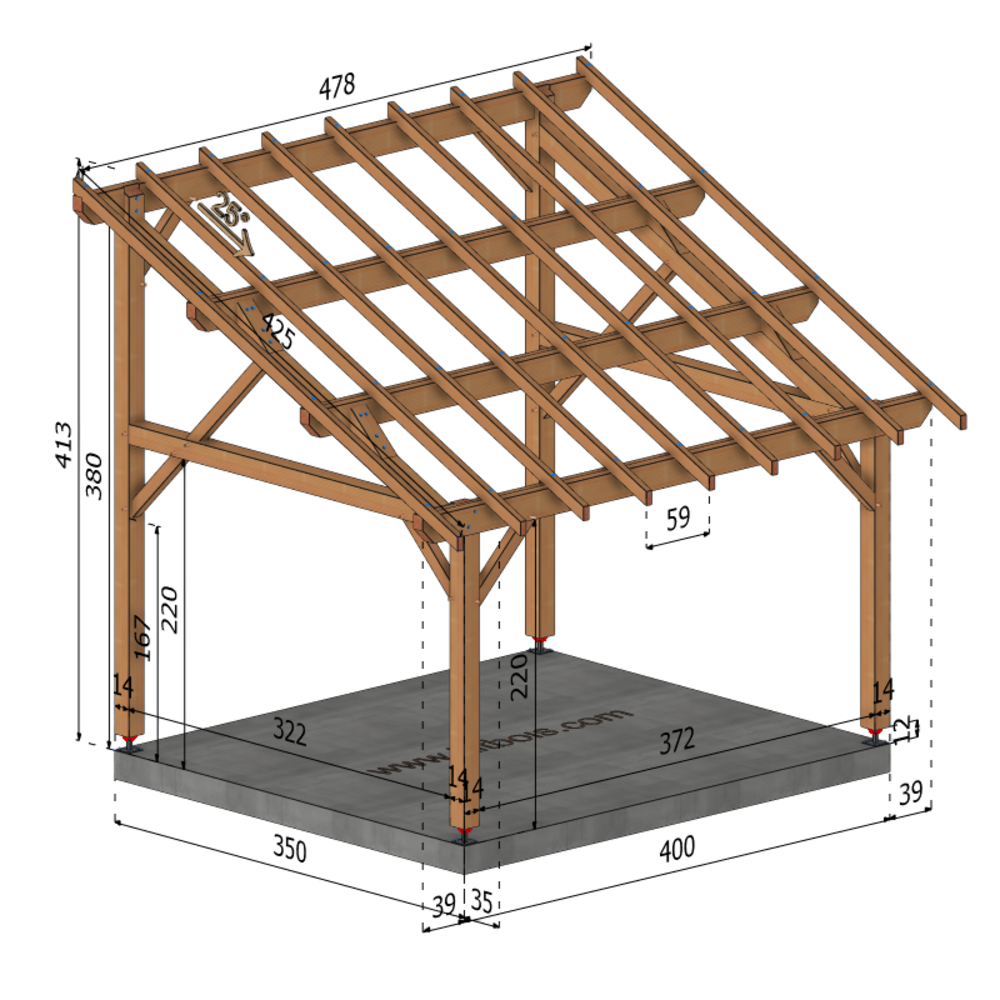 * Surface dalle béton (à réaliser par vos soins) | 3.5 m x 4 m ou 4 plots de minimum 30x30x50 cm sous chaque poteaux.