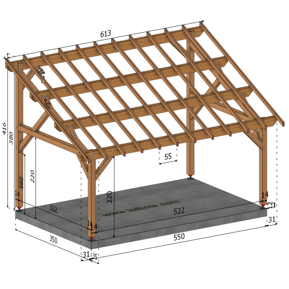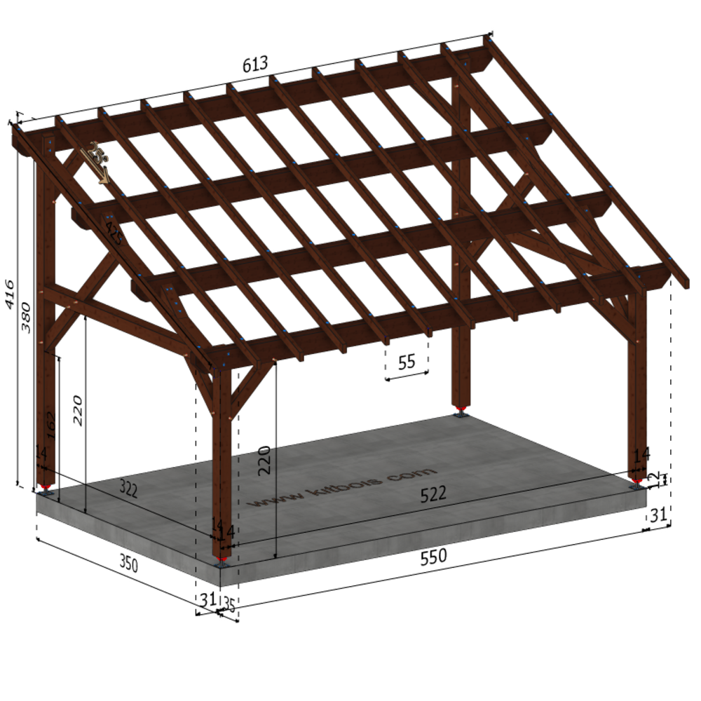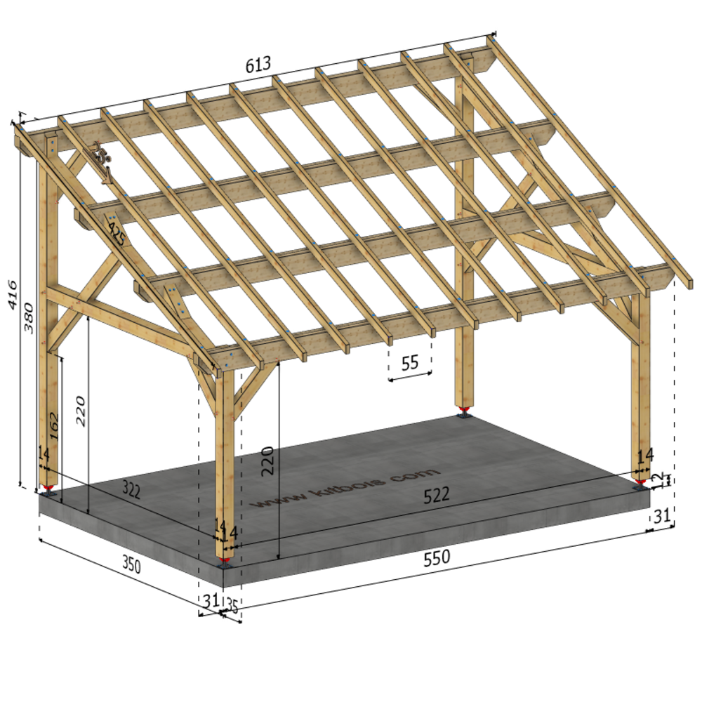 * Surface dalle béton (à réaliser par vos soins) | 3.5 m x 5.5 m ou 4 plots de minimum 30x30x50 cm sous chaque poteaux.